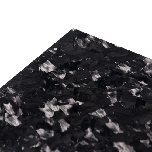 A plaque en fibre de carbone forgée est fabriqué à partir de paillettes de fibre de carbone - petit, fibres de carbone hachées pressés ensemble sous l'effet de la chaleur et de la pression pour former une feuille dense et solide. Au lieu de cela du motif tissé traditionnel, Le carbone forgé présente une texture marbrée aléatoire - comme du marbre noir strié de lumière. Chaque plaque est différente et c'est ce qui la rend unique.